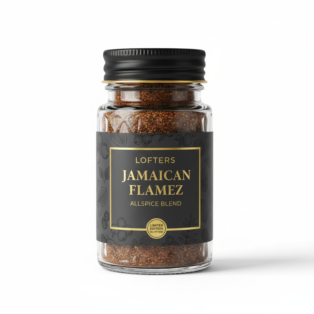 Smoky spicy jerk blend with rare pimento berries saffron threads and gold dust perfect for chicken seafood or lamb